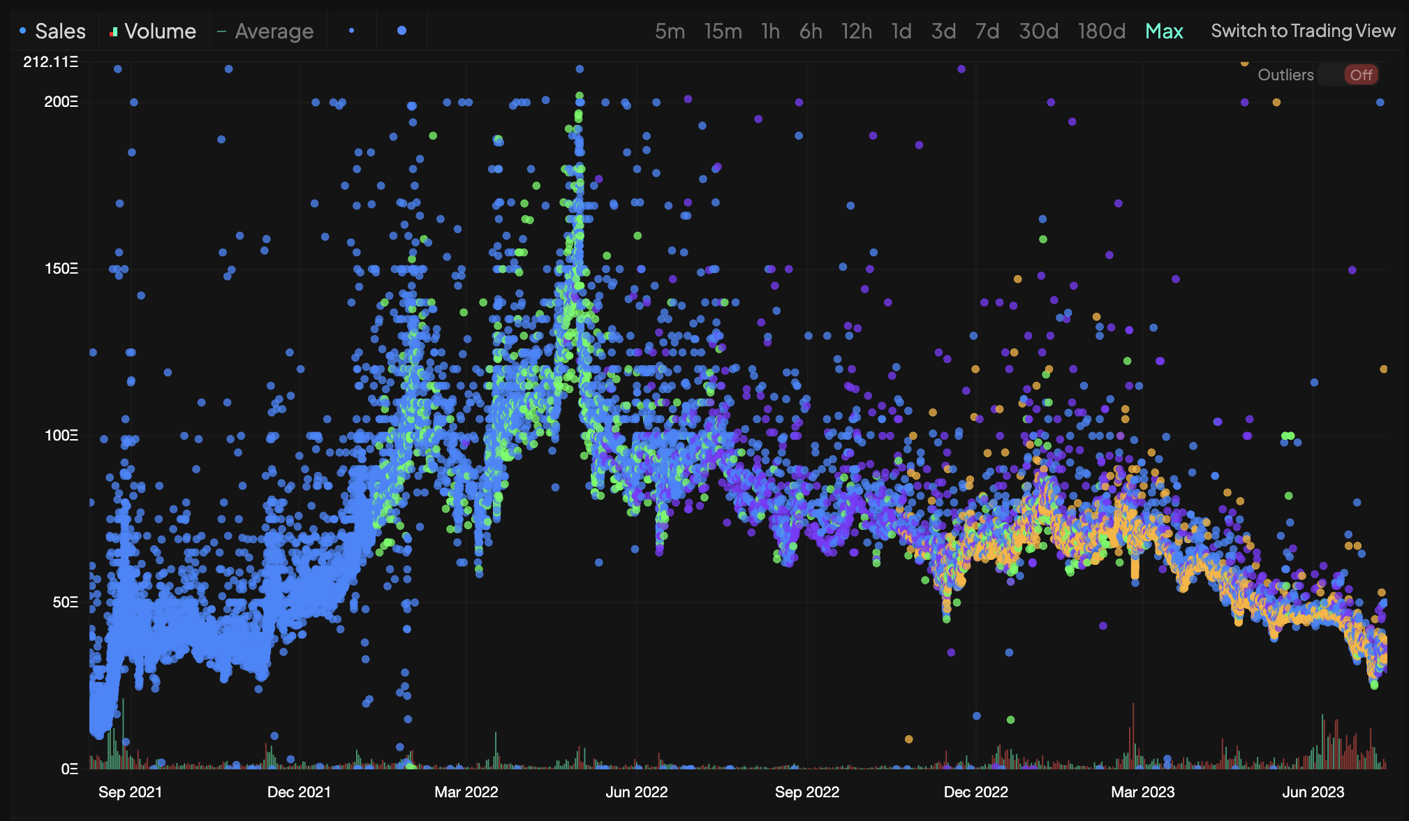<figure><img src="https://3971996483-files.gitbook.io/~/files/v0/b/gitbook-x-prod.appspot.com/o/spaces%2FlcuyoU0cN83b1wOCibmF%2Fuploads%2FELUKc36meGispAapBBD6%2Fimage.png?alt=media&#x26;token=87131763-43d0-492a-8086-7c4e7270f897" alt=""><figcaption><p>Graciously provided by <a href="https://www.degenz.finance">https://www.degenz.finance</a> overview of Board Ape Yacht Club (BAYC) sales and volume suggests something is deeply wrong with current NFT representation. </p></figcaption></figure>