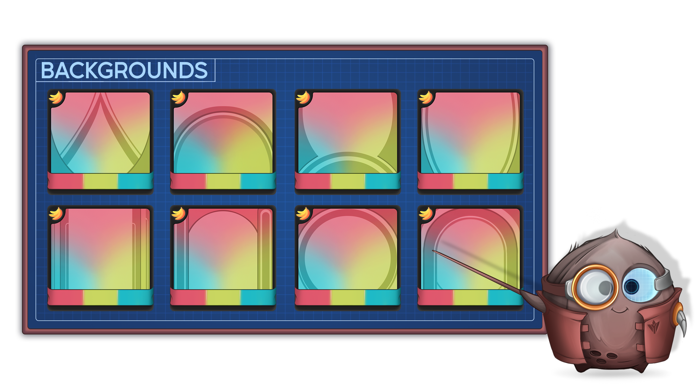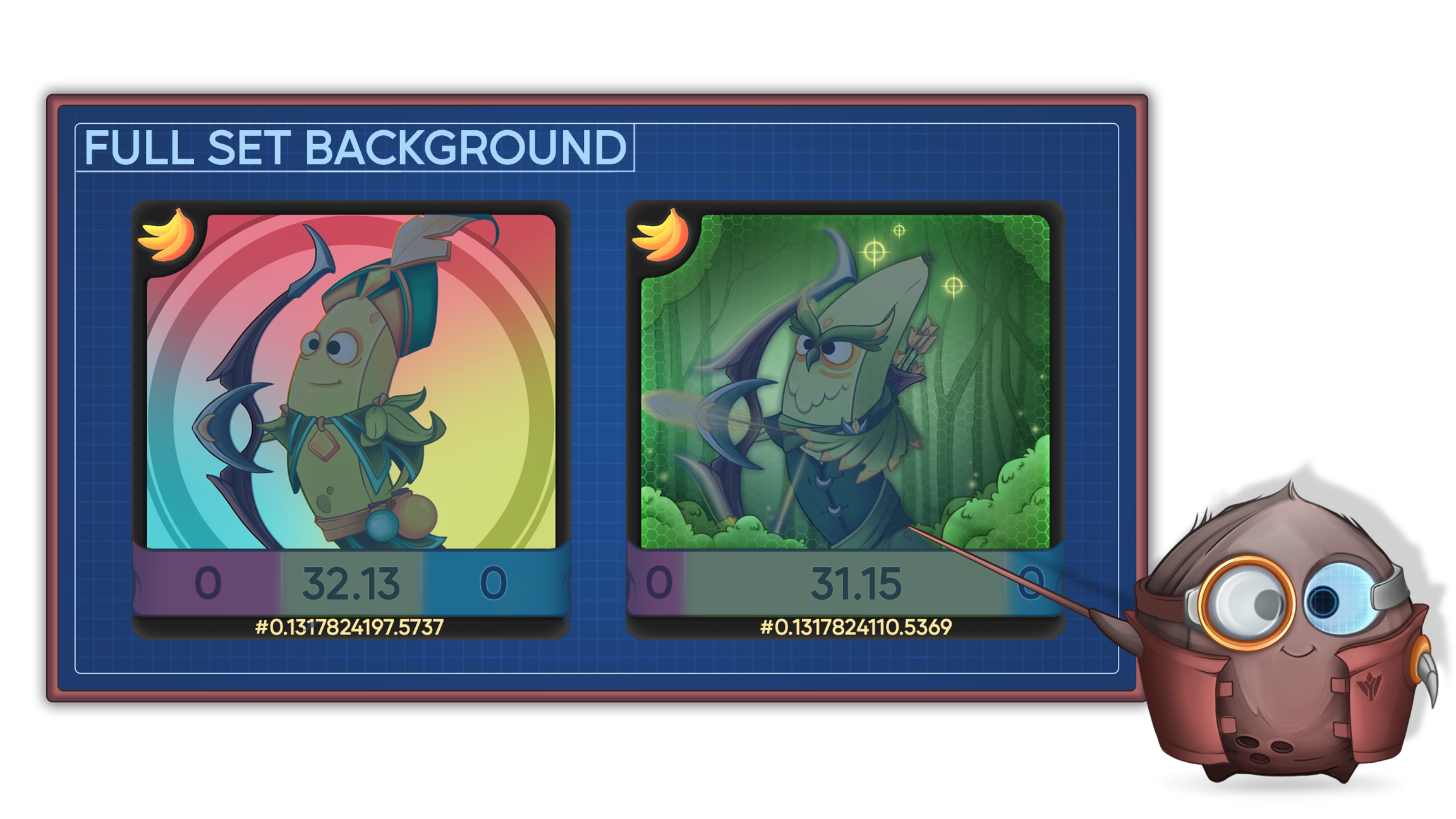 As mentioned earlier, NFT Items can be matched to create a "Full Set" with some battle bonuses. We wanted to help players differentiate between "ordinary" and fully matched sets. In order to create a distinct version of "matched set" NFTs we created unique backgrounds for each full set relating to its overall thematic.