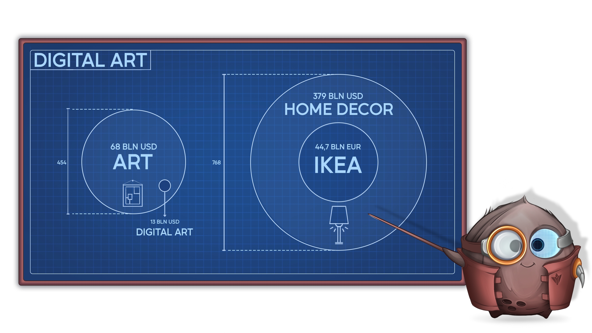 Real life art market is extremely exclusive and by comparison holds insignificant footprint compared to mass markets. In 2022, despite the NFT and digital art slowdown, the global art market generated nearly 68 Billion U.S. dollars. This includes everything from digital art to paintings and even sculptures. By comparison a 2023 Global Home Decor Market report estimates global Decor Market at 739.87 Billion U.S. dollars.